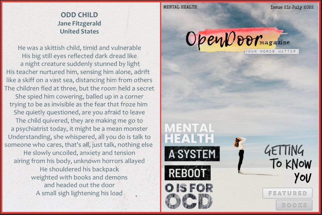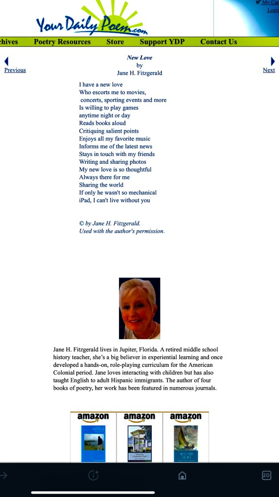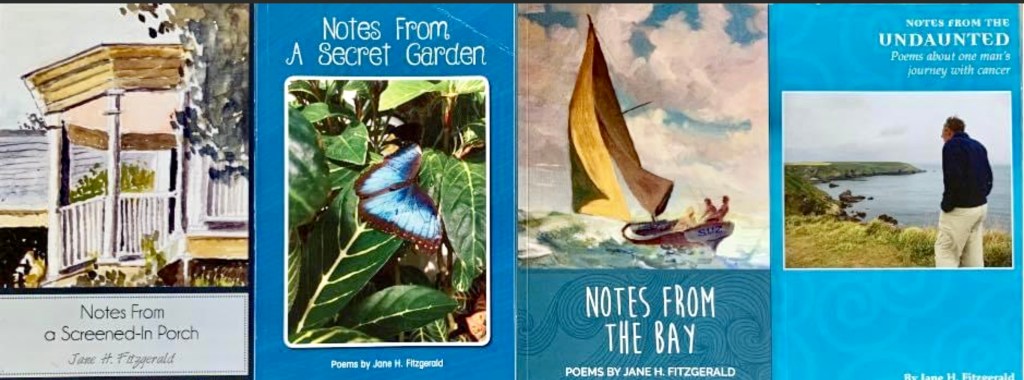 Jane H Fitzgerald is a retired teacher who is now a poet. Writing about people, nature, time, and the absurdities of life is her passion. Jane is the author of four books and has been featured in many print journals and online sites including ; Little Old Lady Comedy, Your Daily Poem, Isele Quarterly, Devil’s Party Press, Open Door Magazine, Green Ink Poetry, and more. Jane relates to all ages and diversities of people, and hopes that her writing creates a bridge of understanding to others. Jane lives in the sunny state of Florida.