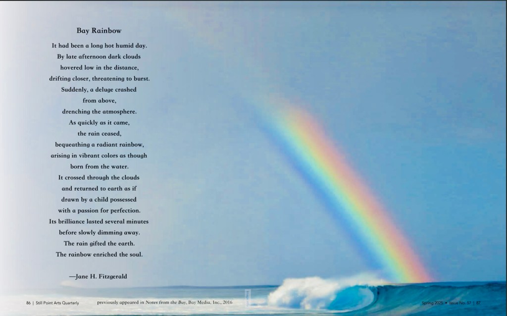 Thank You to Publisher and Editor, Christine Cote, for publishing my poem, Bay Rainbow, in the latest issue of Still Point Arts Quarterly, March 1, 2025.