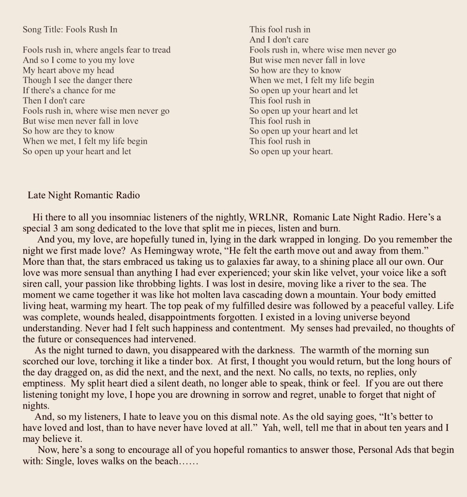 Here’ my prose song poem on, Fools Rush In.
